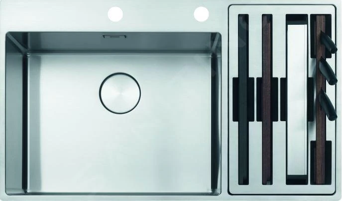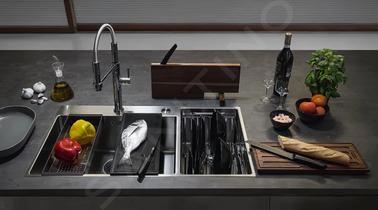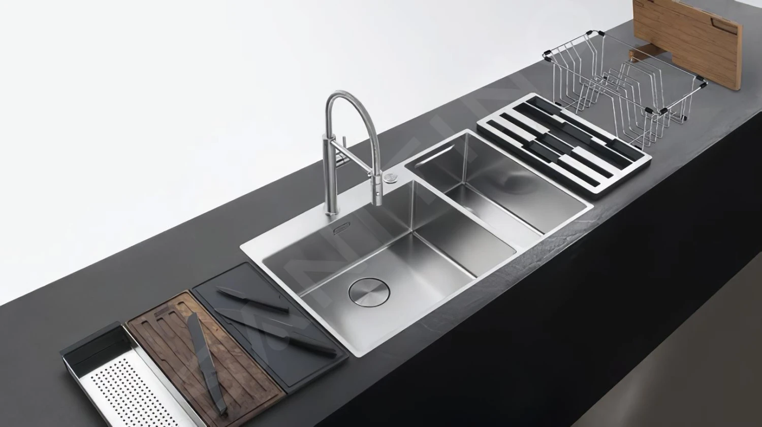 Es una solución inteligente y muy práctica con un diseño bonito y convincente. Dos fregaderos magníficos ofrecen espacio para almacenar y secar accesorios de cocina de uso frecuente que se almacenan justo donde más los necesitas.