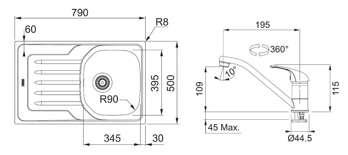 - fregadero: 345 x 395 x 160 mm