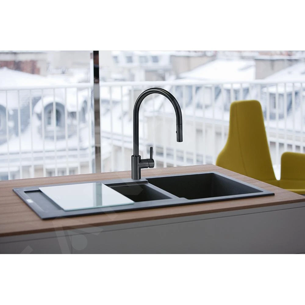 Franke Eos Neo también cuenta con un caño extraíble equipado con un perlizador, que va acompañado de una manguera de ducha trenzada de 180 cm. El grifo tiene un caño giratorio de 180°, una altura de 433 mm y una longitud de caño de 231 mm. Eos Neo es delicado, con un caudal no superior a 9 l/min a 3 bar.